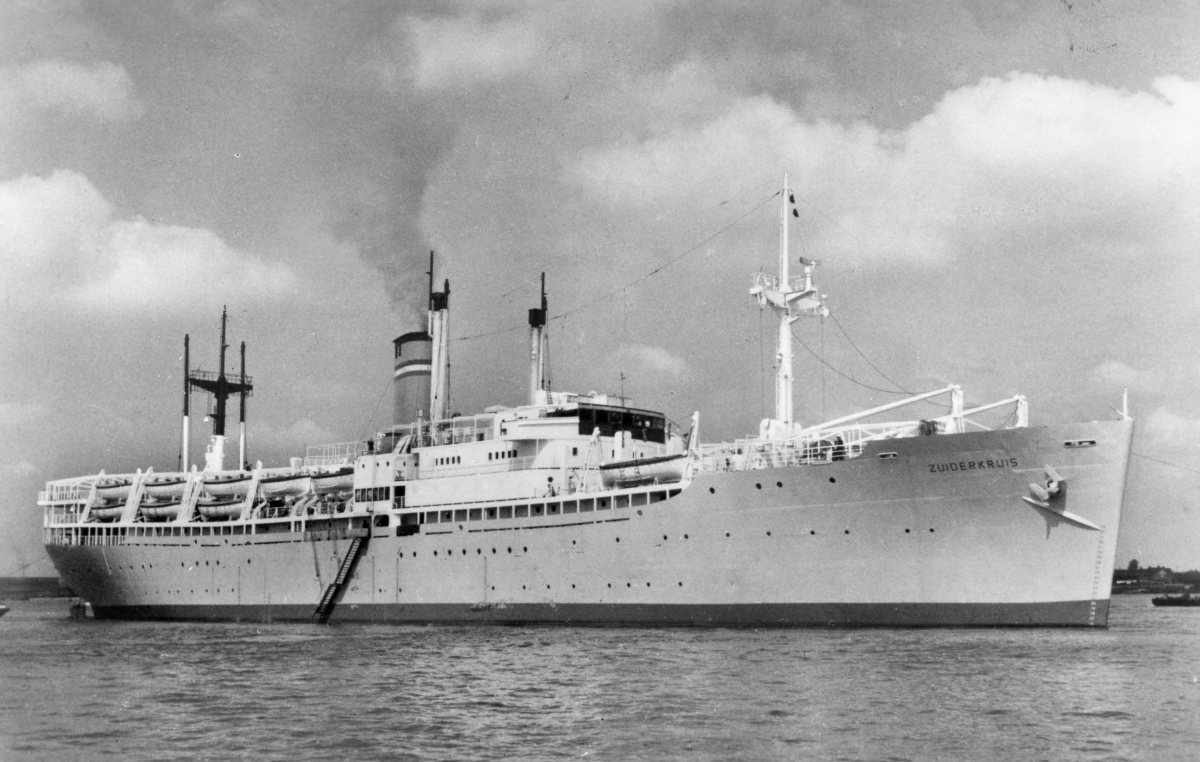 Finally, in the last week of May, the big day arrived. I vaguely remember us riding on a bus to Rotterdam, one uncle with us, ending on the quay of the Rotterdam Lloyd. Two other uncle/aunt couples had brought the Oldsmobile to Rotterdam to have it put on a freighter. They were all on the quay. Moored there was our ‘Victory ship’ the ZUIDERKRUIS that we had already heard about. There was a huge crowd there, we had to say goodbye to our dear family, queue up for passport- and other controls, get our cabin numbers, check our luggage. Then, yes we came to a gangplank. I had a lump in my throat, felt that plank took me away from Holland to an unknown future. I could see Dad struggling with his emotions as he took the younger ones by the hand and went up that plank to an intermediate deck. Mom gave us our cabin number and let us go. We bounded up to the upper deck where we could see much of Rotterdam, its harbours, factories and endless rows of houses. It seemed everybody went to this upper deck on land side and I wondered whether the ship could tip as a result. A rough and quick calculation- one thousand people with luggage weigh about 100 000 kg = 100 tons. The ship weighs about ten thousand tons, hence people weigh less than 1%, so not to worry. This sort of rational approach to uncertain circumstances is one of my character traits, one not much appreciated by many people, I found.